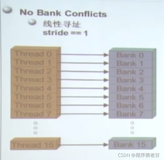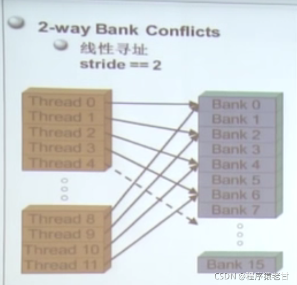 很多线程访问存储器,因此存储器被划分为banks;连续的32位访存被分配到连续的banks;每个bank每个周期可以响应一个地址。如果有多个bank的话可以同时相应更多地址申请。出现多个bank冲突,会影响效率。