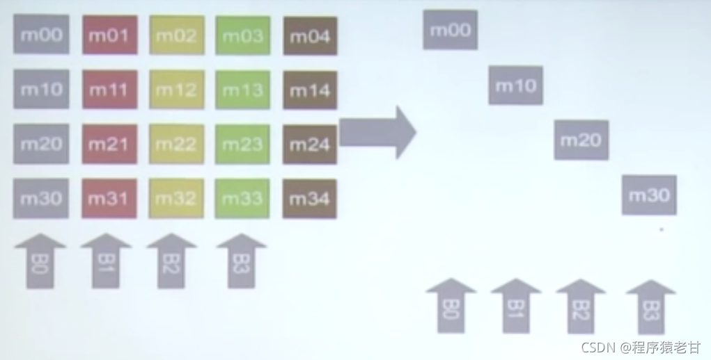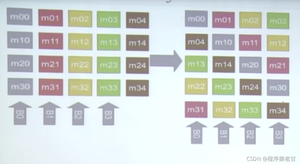 左侧,如果竖向访问,一定会产生bank冲突。但是如果按照右边的方式,逻辑上对左侧矩阵的竖向访问也不会产生bank冲突,因为相邻关系被重新安排了。