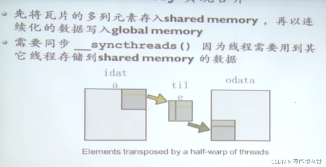 合并访存:global memory带宽很大,但是具有较高的延迟。因此需要在访存时实现基于Wrap的合并访存以提高效率(我的理解是,线程访存与存储位置应该具有次序,以实现合并访存)