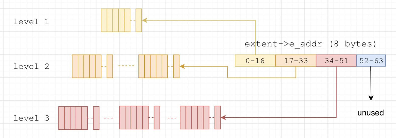 全局唯一的存放每个 extent 信息的 Radix Tree,以 extent->e_addr 即 uintptr_t 为 key,以我的机器为例,uintptr_t 为64位(8字节), rtree 的高度为3,由于 extent->e_addr 是 page(1 << 12) 对齐的,也就是说需要 64 - 12 = 52 位即可确定在树中的位置,每一层分别通过第0-16位,17-33位,34-51位来进行访问。