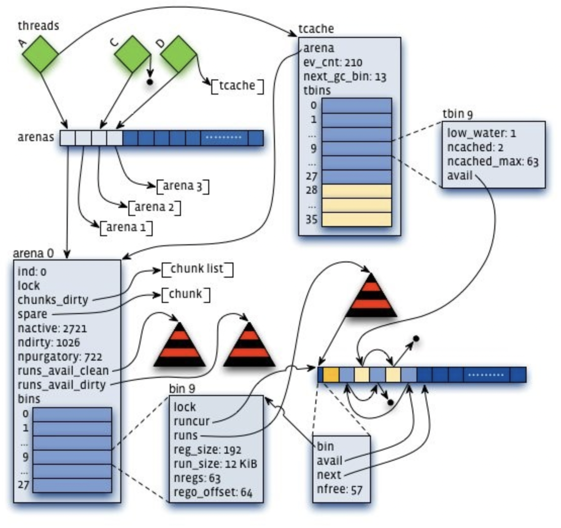 旧版本的jemalloc中, 每个arena内都会包含对应的管理信息,记录该arena的分配情况。arena都有专属的chunks, 每个chunk的头部都记录了chunk的分配信息。在使用某一个chunk的时候,会把它分割成很多个run,并记录到bin中。不同size的class对应着不同的bin,在bin里,都会有一个红黑树来维护空闲的run,并且在run里,使用了bitmap来记录了分配状态。此外,每个arena里面维护一组按地址排列的可获得的run的红黑树。