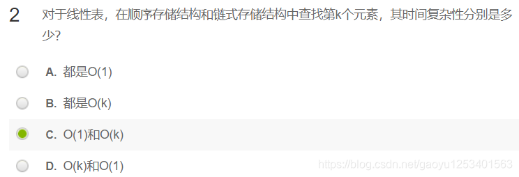 解析:因为顺序存储的方式是数组,故在数组中查找第k个元素,一步就能找到;在链式存储结构中,其存储形式是使用链表,由于每个节点都存储了下一个节点的地址,因此无法一下子知道第k个元素在哪里,需要一步步的查找,寻找第k个元素需要查找k步。