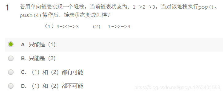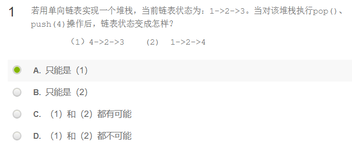 解析: 对于堆栈来说,插入和删除操作只在链栈的栈顶进行,故对于1->2->3来说,栈顶在1处,故删除1,然后插入4,得到4->2->3.