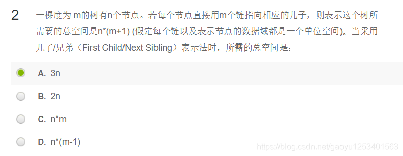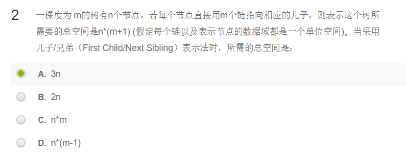 解析:对于儿子-兄弟表示法,其每个结点寻存三个数据(结点本身,此结点的第一个儿子,此结点的下一个兄弟),故所需空间为3n。