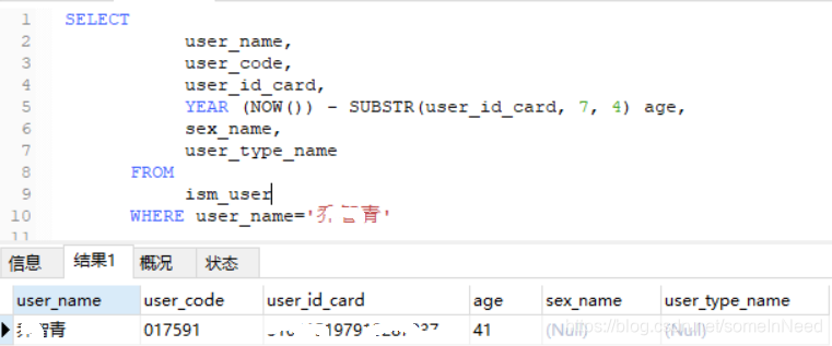 YEAR (NOW()) - SUBSTR(user_id_card, 7, 4) age,