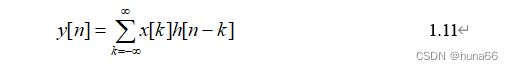 这个表达式就是LTI系统的卷积模型,它是根据系统的线性性和时不变性以及信号可以分解成单位冲激函数经推理得到的。这个表达式实际上告诉了我们一个重要的结论,那就是,任意LTI系统可以完全由它的单位冲激响应h[n]来确定(Any discrete-time LTI system can be completely specified by its unit impulse response)。由于系统的单位冲激响应是零状态响应,故按照式1.11求得的系统响应也是零状态响应。式1.11中的求和运算叫做卷积和,是描述离散时间LTI系统输入输出关系的一个重要表达式。