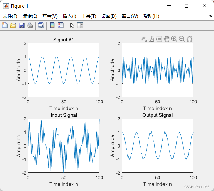 下面我们通过从若干个正弦信号之和组成的信号中滤出高频分量,来研究式(1.13)表示的该移动平均滤波器的使用。实验用程序如下