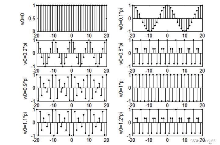 subplot(423), stem(n,x2,'k.') ,ylabel('w0=0.2*pi')