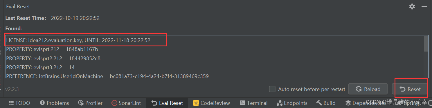安装并重启 IDE 后,在菜单栏 Help 下会多出 Eval Reset 选项,点击进去后就可以重置了。唤出的插件主界面中包含了一些显示信息,2 个按钮,1 个勾选项: