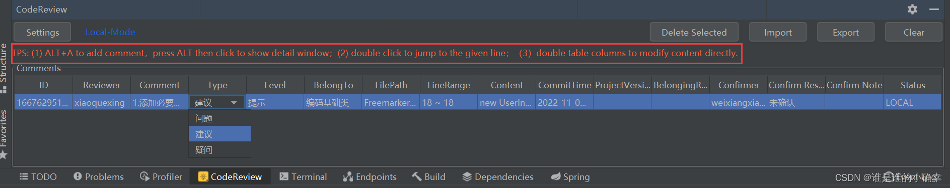 - 可以在代码中标记评审意见,并汇总导出为 Excel 表格;或者将别人的 review 意见导入到 IDEA 中,支持代码跳转查看。