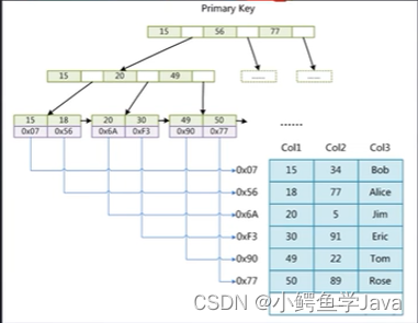如上表所示,如果索引为col1=18,因为col1为索引,然后在.MYI文件中通过B+树查找到18所在的叶子节点,得到对应地址,再返回到.MYD文件得到对应的数据。