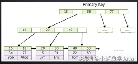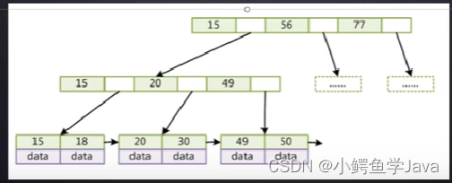 首先知道什么是B+树,如图所示,B+树非叶子节点不存储数据,只存储索引,目的是储存更多索引,因为一个节点大小为16K(一个索引和一个地址加起来占14B)