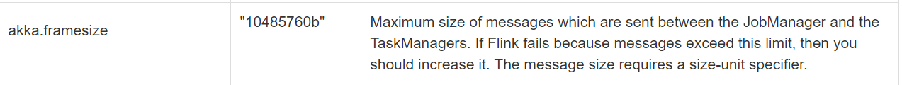 - akka frame大小(默认10M): jobmanager和taskmanger之间传递的消息的最大限制。