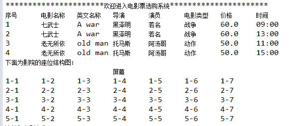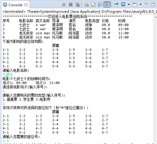 - 第三,提示用户输入(电影名称、场次、座位号、票的种类)同时进行判断;同时对出票信息进行存储