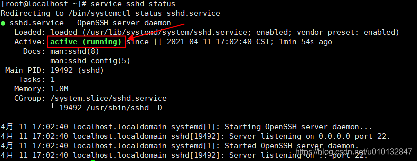 备注:操作ssh服务命令(启动:service sshd start; 重启:service sshd restart; 终止:service sshd stop; 状态查看: service sshd status)
