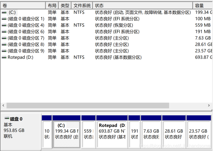 ②看自己的硬盘个数:此电脑图标右键-管理-磁盘管理(我这里是个改装的1T固态)