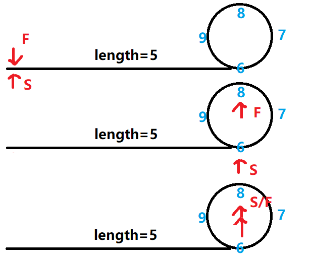 第一阶段:慢指针S走到环的入口,此时走了6步,快指针F走了12步,则快指针先走完了直线跑道6+一个环4+新的步数2;此时F会停在节点8的位置(这个大家在心中模拟一下)