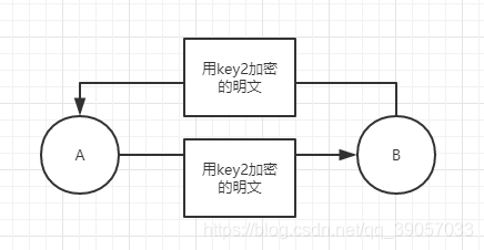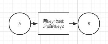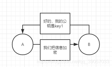 小A收到小B的公钥key1以后,小A自己生成一个对称加密的秘钥key2,并且用key1对key2进行加密,发送给小B: