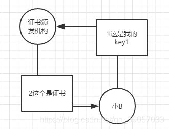 3 当小A向小B发送请求通信的时候,小B不在把自己的公钥key1发送回去,而是把自己申请的证书发送给小A。
